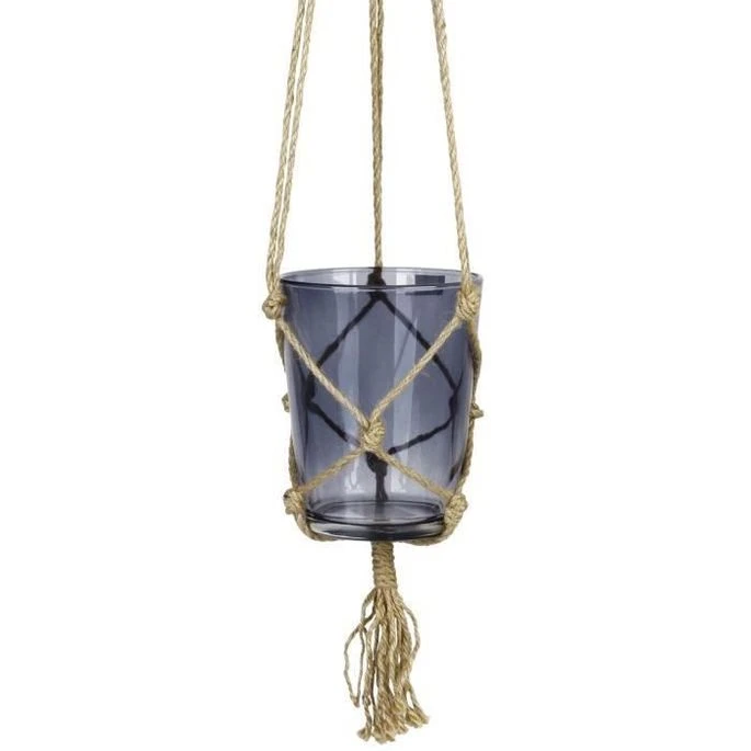 Suspension Pot En Verre – Avec Corde En Chanvre – Ø 13 X 16 Cm – Gris Foncé
